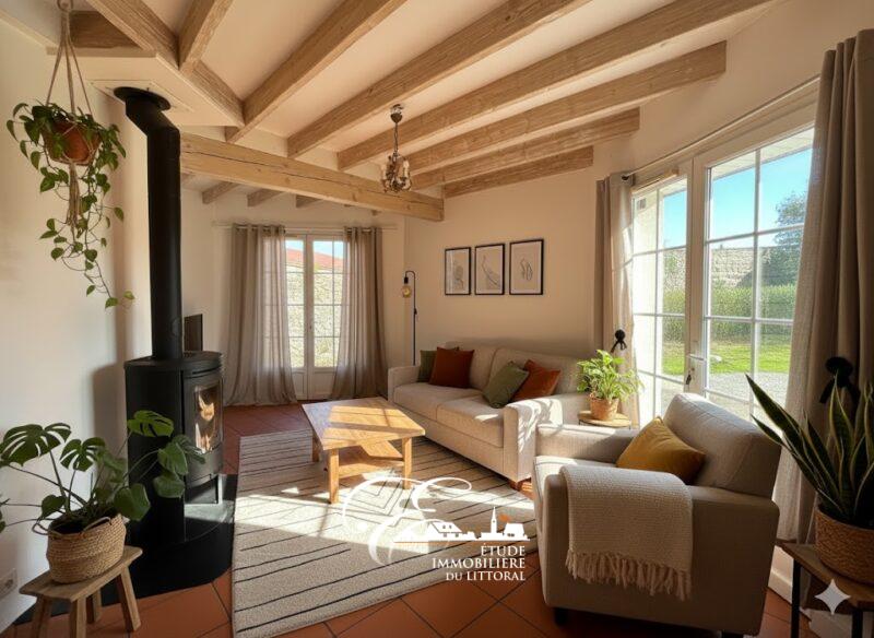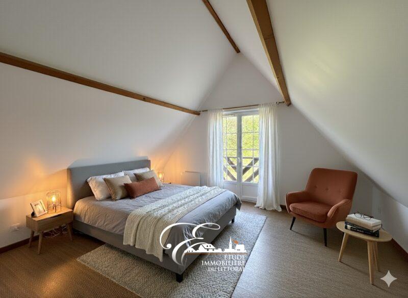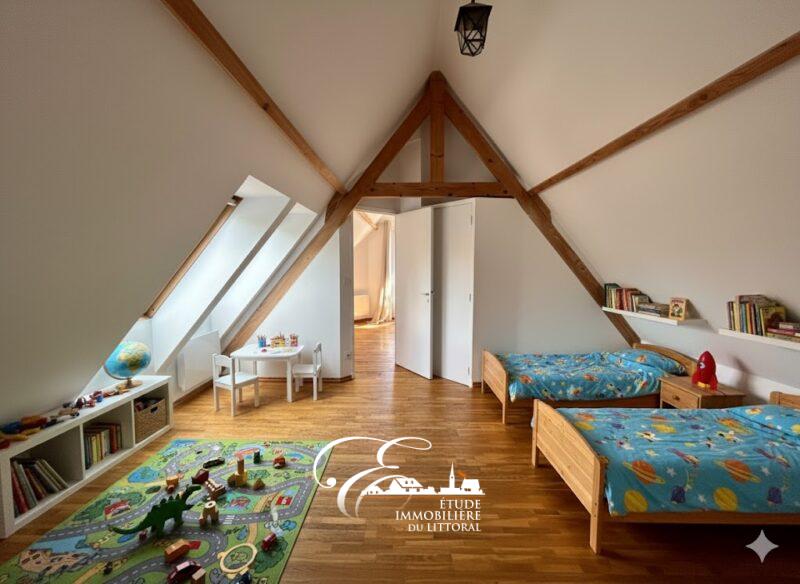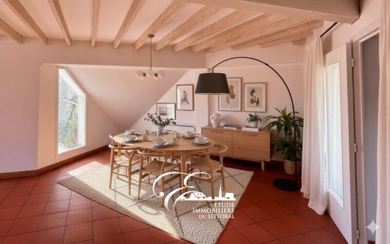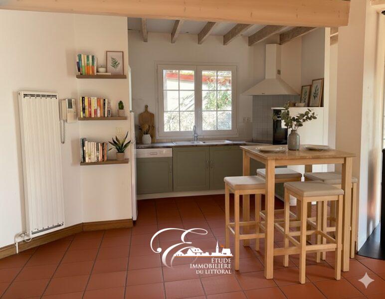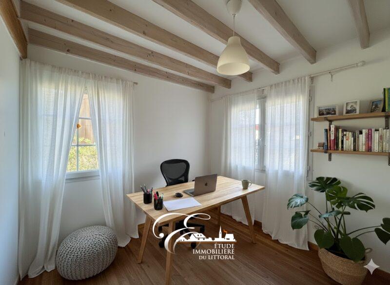 – Au rez-de-chaussée : hall d’entrée avec placards de rangement, salon/séjour ouvert sur cuisine aménagée et équipée, salle de bains, une chambre, bureau et WC.