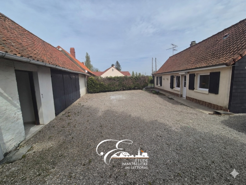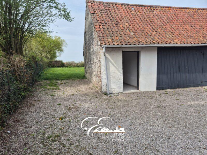 Grand garage, cour en cailloux et terrain enherbé.